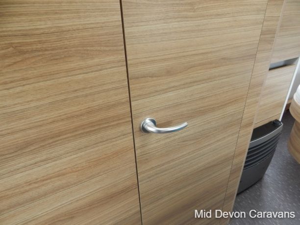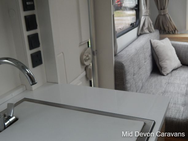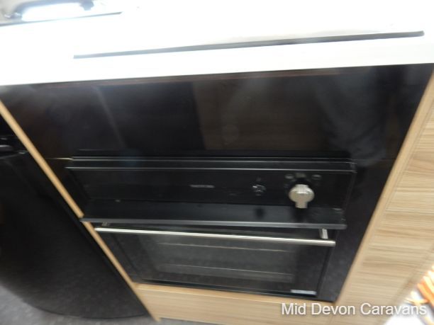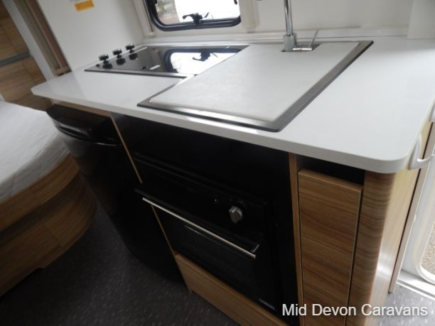 The space in the centre of the caravan is shared by a nearside kitchen and offside washroom. The kitchen has a three-burner inline hob and sink plus a combined oven-grill and a Thetford fridge. A large cupboard overhead provides good storage space, plus there’s a small pan cupboard underneath the oven.