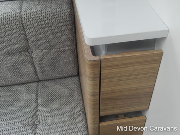 One stunning design feature of Alteas is the white lighting set into the bases of floating locker bases all around the caravan