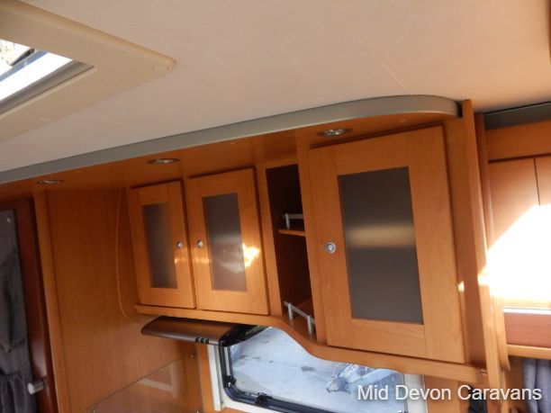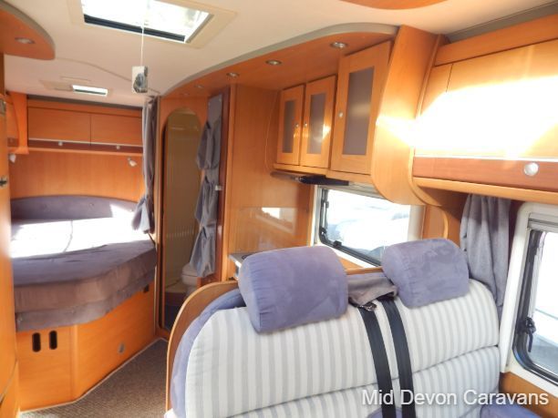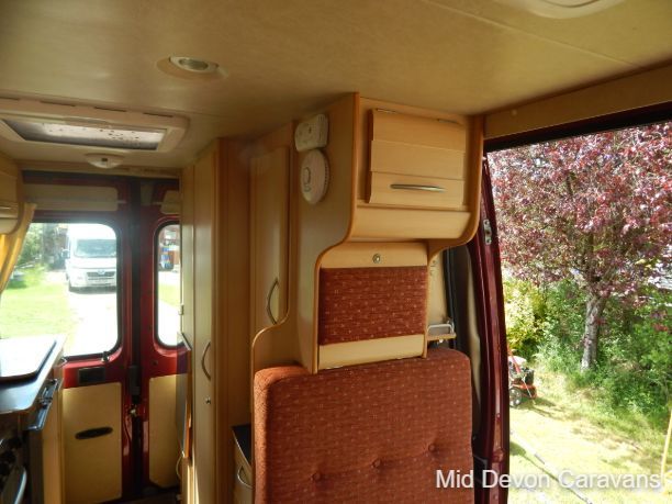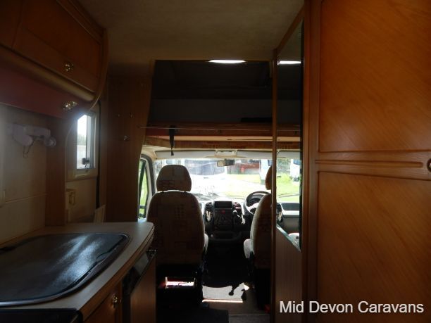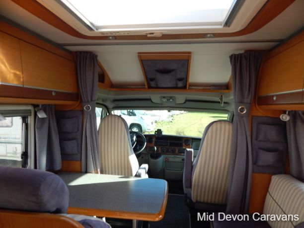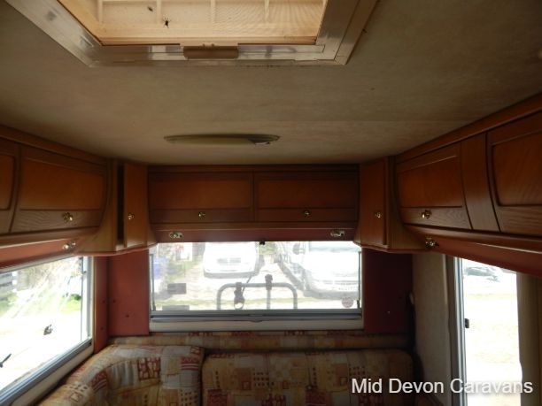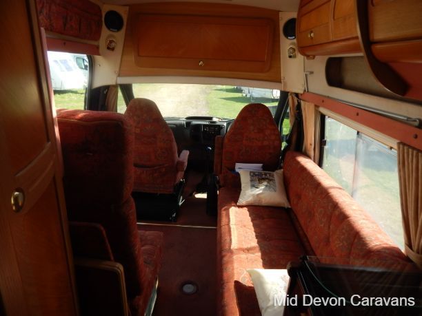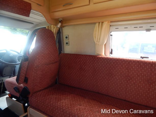 Designed for two people only, there is plenty of lounge space, thanks to wide, open, sideways-facing seats. The interior is well equipped with lights, both spots and fluorescents, and the quality of the wooden cabinets is high, The over-cab area is relatively open and offers excellent access to the cab area. Under-seat storage is fair, with external access to the seat base on the near side.