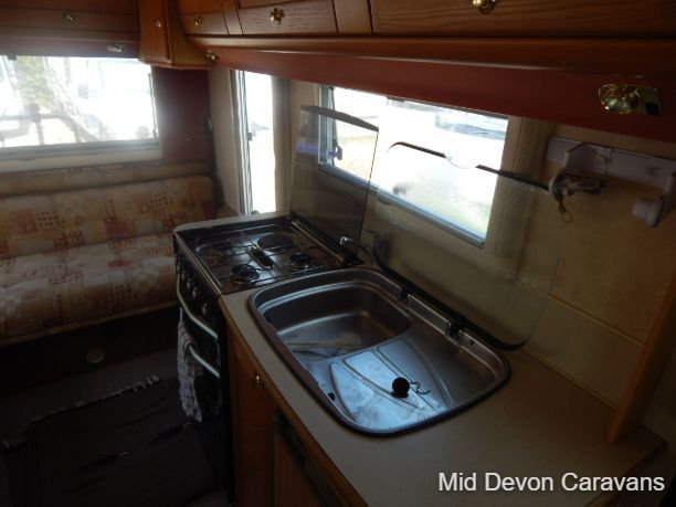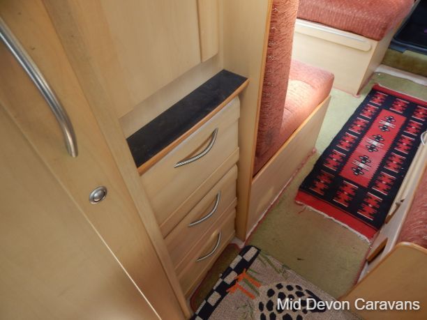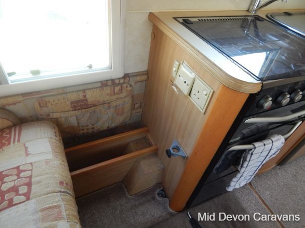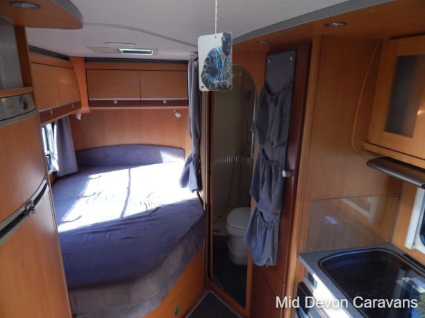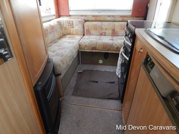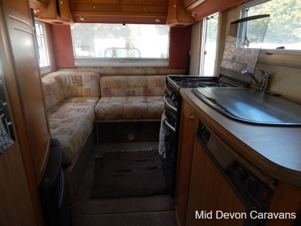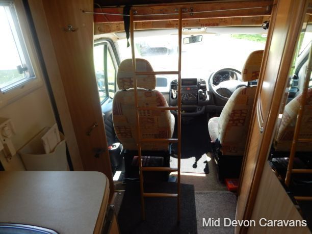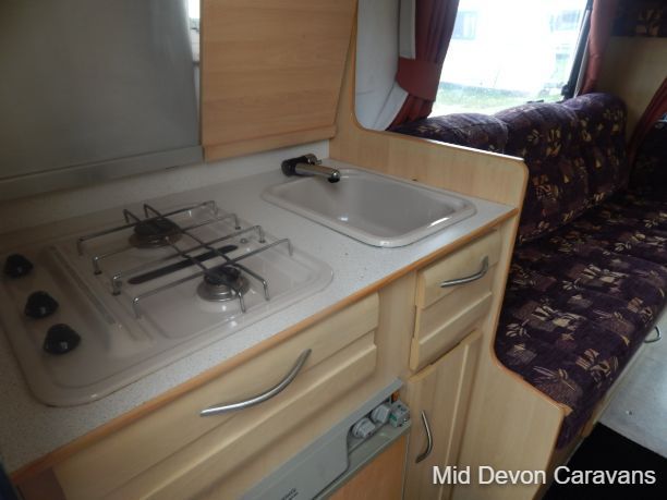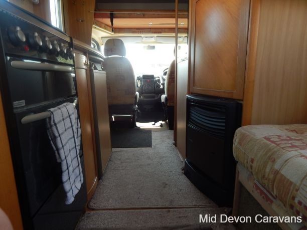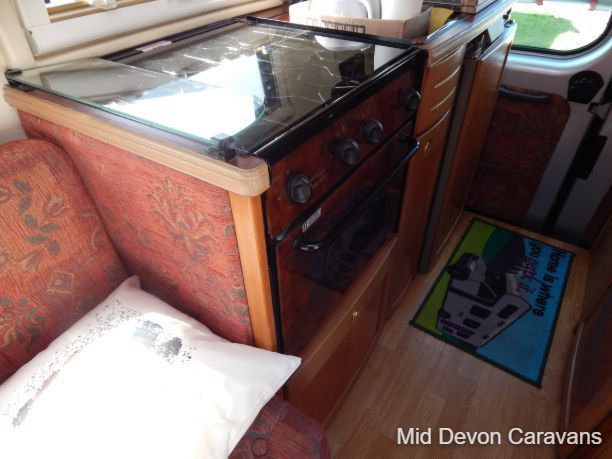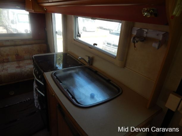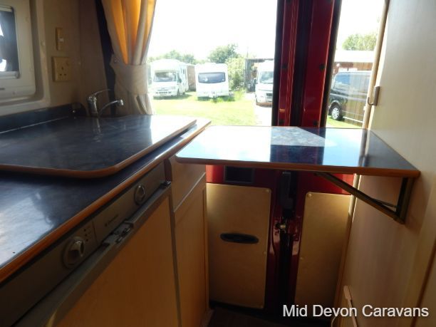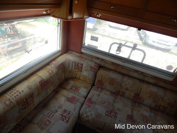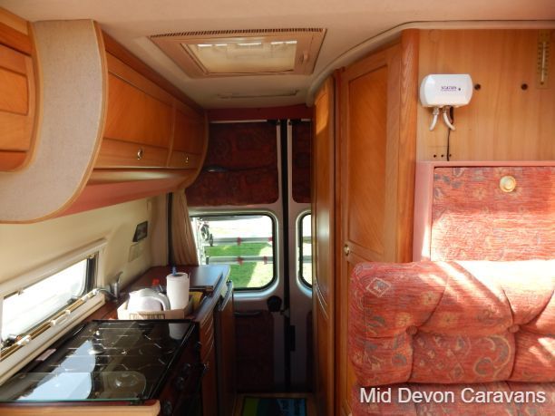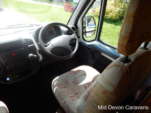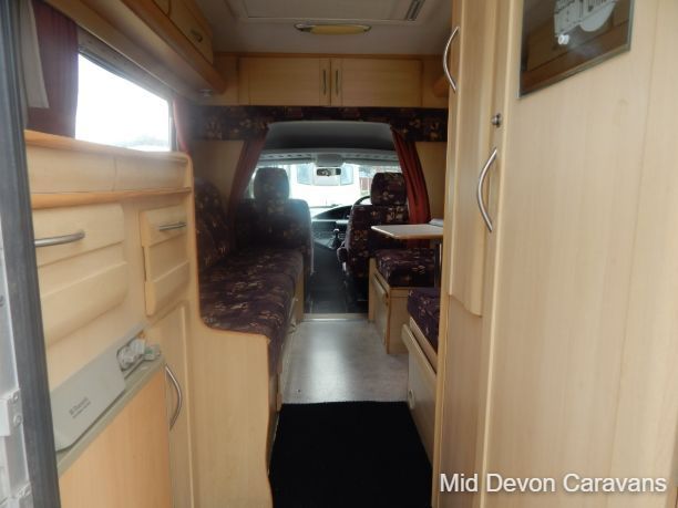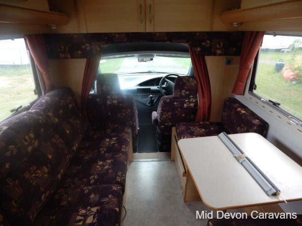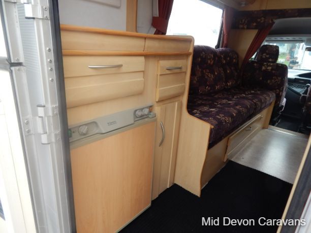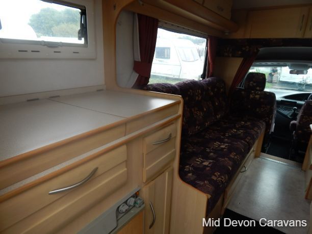 The Auto-Sleeper Ravenna HDI, 2004, Coach was built on the 3300kg Peugeot chassis, a 5-speed manual gearbox, and a diesel. 1997cc, 125BHP, 3 Belts, 4 Berth. Upon entering the habitation area of this well-looked-after motorhome, you will notice the main feature being the good-sized L-Shape lounge with large windows to soak up all that natural light. There are 2 tables, one for dining that can be stored away in the wardrobe, and a small movable table. This area converts into a large double bed. You also have the spacious over-cab double bed to complete the 4 berth.