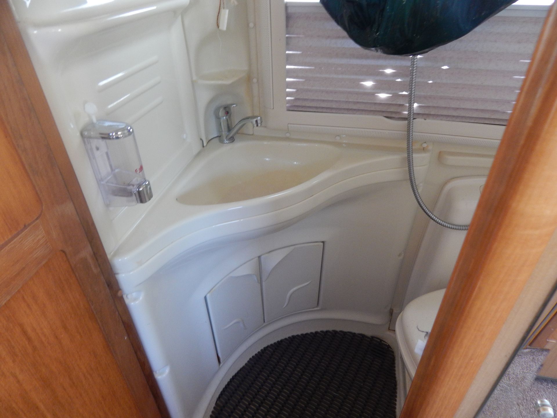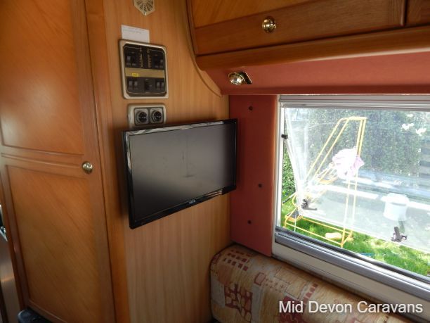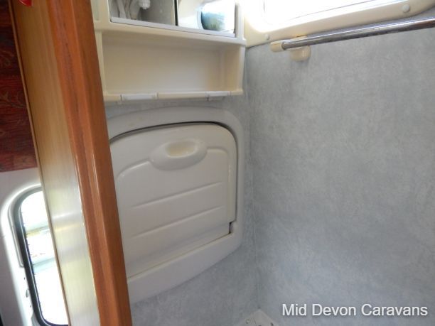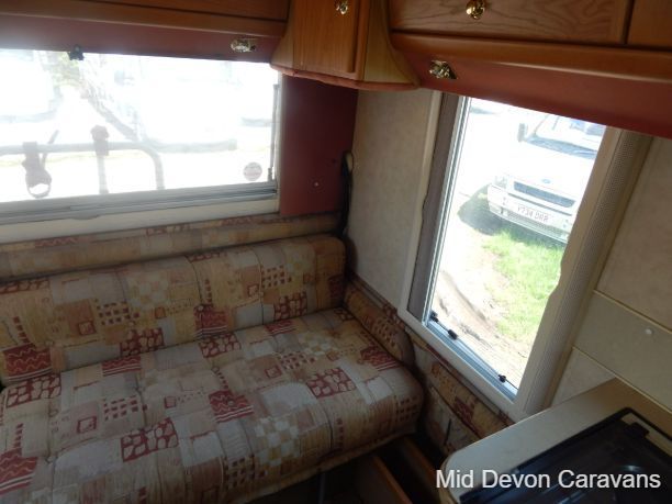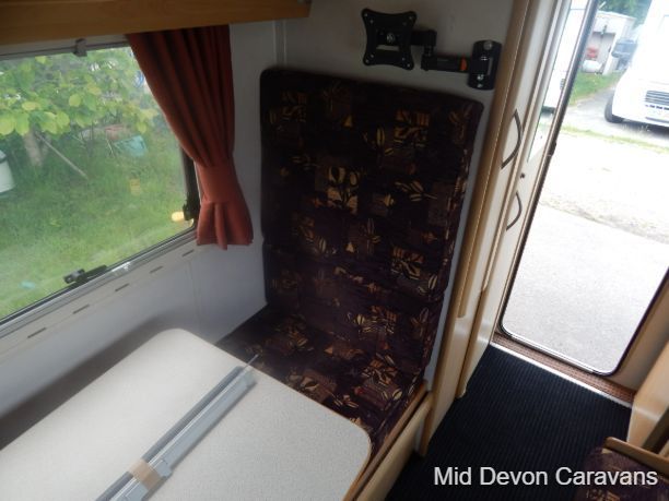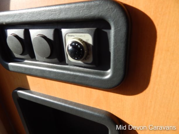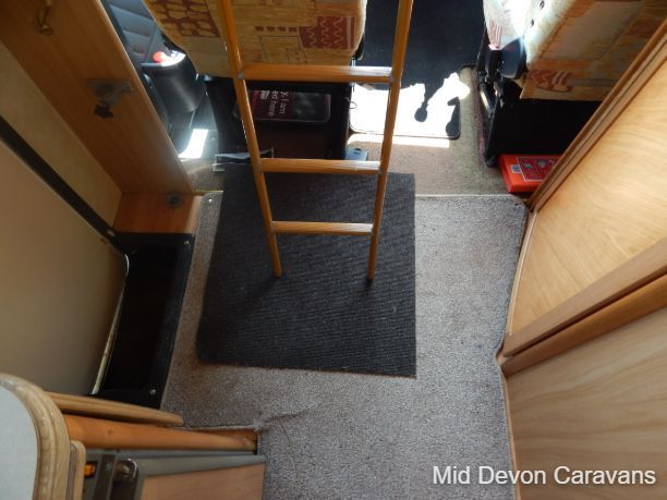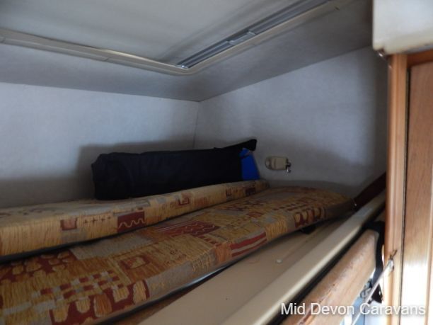 The lounge is bright and roomy with plenty of windows all around and a large skylight above. The lounge consists of 2 single-seaters on the entrance by the side door, with a comfortable double seater opposite. All this converts easily into 2 singles or a large double bed. There is a fold-away table for dining if needed.