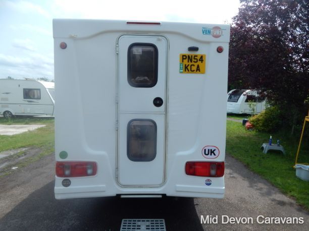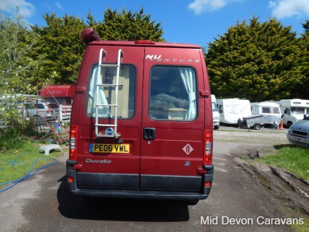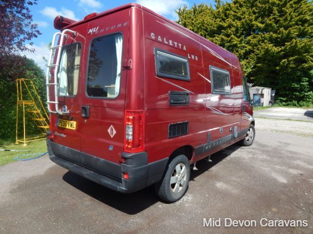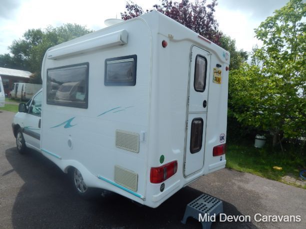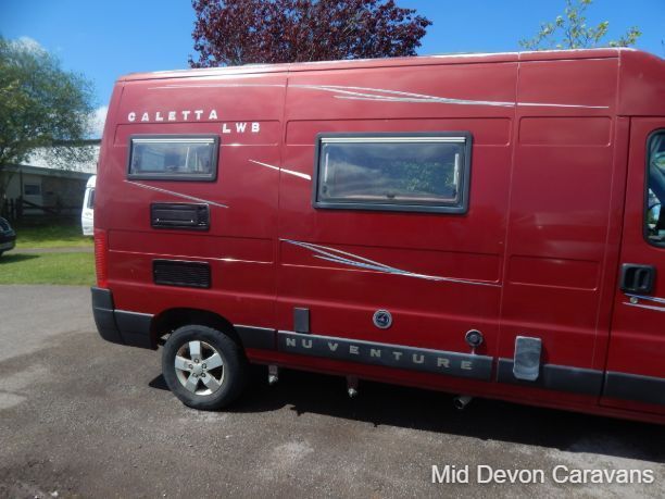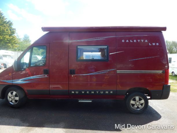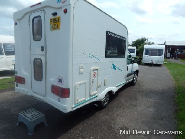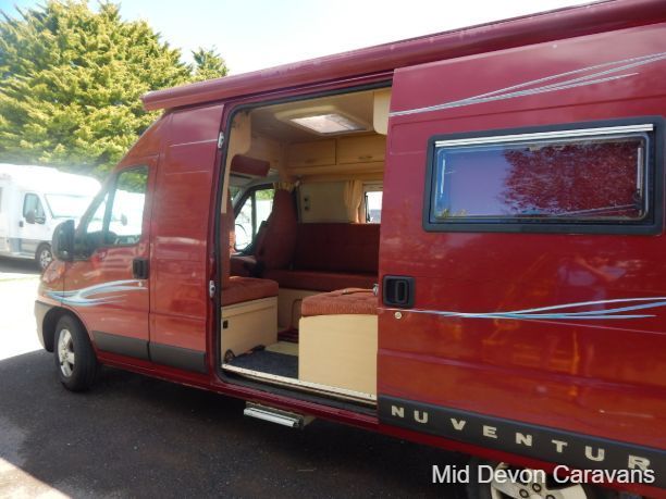 The 2004 Nu Venture Surf is a compact, well-made motorhome, often praised for its efficient use of space and car-like driving experience. It's a two-berth (two single or a double) campervan, based on a Fiat chassis. The interior features a dinette, a bathroom (with a flushing toilet but no shower), and a kitchen with a two-burner hob and a three-energy source fridge. The sleeping arrangement can be configured as two single beds or a double, and the van includes a Fiamma wind-out awning.