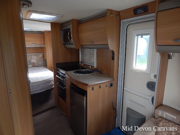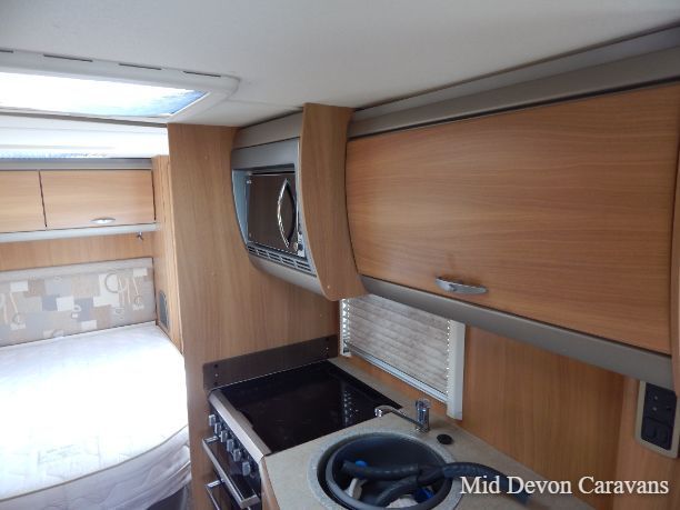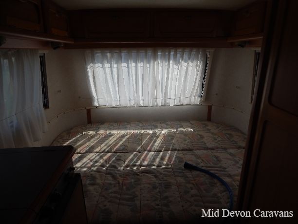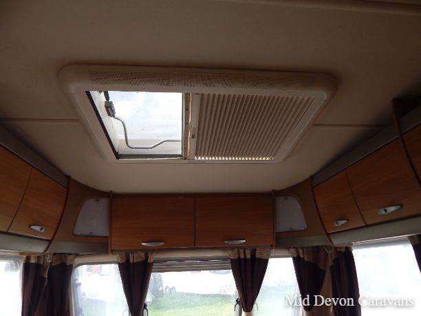 To the front of the caravan are two large opposing settees, which are separated by a drawer unit with a pull-out table. The two settees combine to make a large double bed, and under the settees is storage space as well as the storage space in the above lockers. The large Heki rooflight provides great natural light and ventilation, and all the windows and rooflights have blackout blinds and flyscreens.