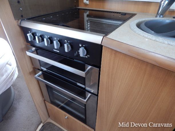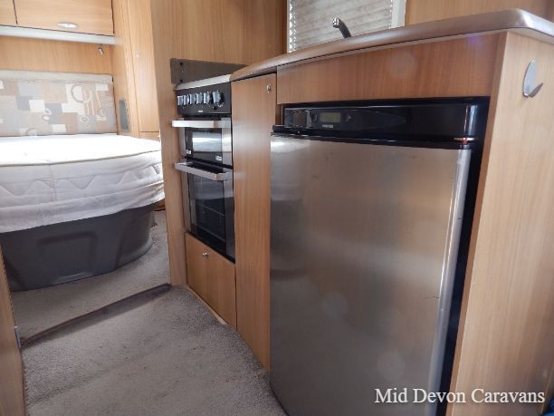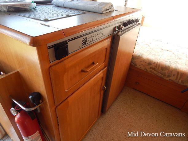 The space in the centre of the caravan is shared by a nearside kitchen and offside washroom. The kitchen has a three-burner inline hob and sink plus a combined oven-grill and a Thetford fridge. A large cupboard overhead provides good storage space, plus there’s a small pan cupboard underneath the oven.