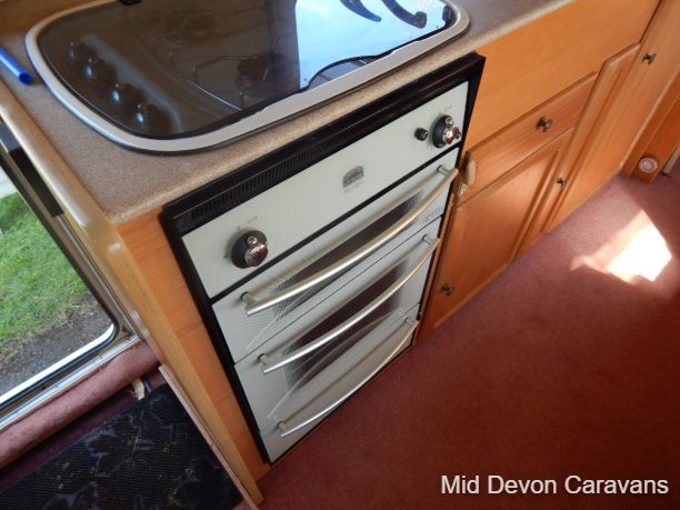 The Avondale Leda Grampian is a 4-berth caravan with an end washroom. Beds can be made up from the front parallel seating area. There’s also a small dinette area in the centre of the van, which can be converted into a bed, featuring a single bed with a bunk overhead. kitchen with 4 burners, grill, gas oven