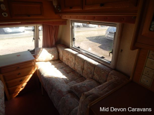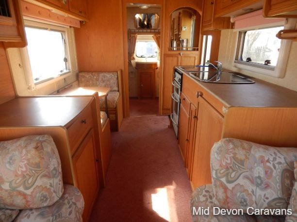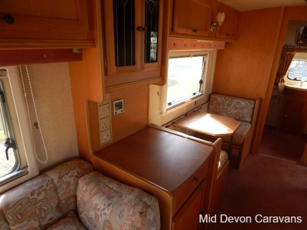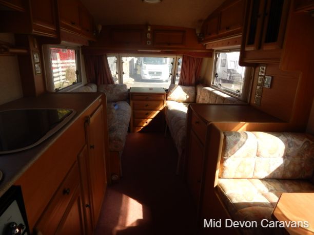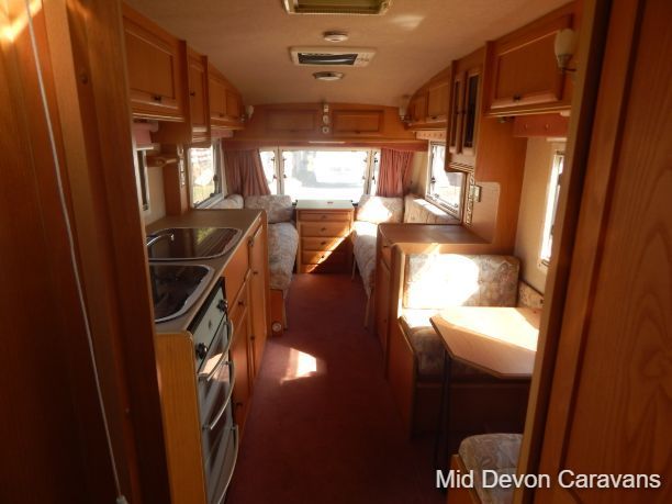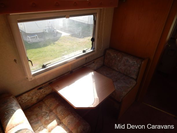 Abbey Impression 2 berth caravan full seating area at front with table, which converts to a double bed. Toilet/ shower and wardrobe rear Kitchen