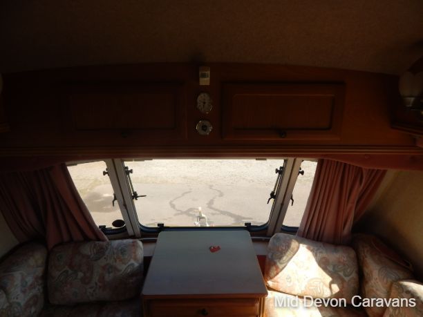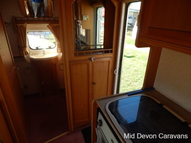 The front section of the caravan has a lounge area with large panoramic windows, aircraft-style overhead storage cupboards, and a chest of drawers with a fold-out table. The wooden slats for the pull-out bed roll out from under these drawers. The lounge comfortably seats 4 people. The 2-seater dinette can be converted into 2 sturdy bunks (with ladder and safety rail). There is a privacy curtain that can be drawn around the bunks when they are in use. The well-appointed kitchen has a 4-ring gas hob, a separate grill and oven, and a 3-way fridge. There is plenty of food/cooking utensil storage space and ample worktops. The very spacious end bathroom has a Thetford cassette (electric flush), a separate large 'walk-in' shower cubicle, a sink, bathroom cabinet, wardrobe, and mirror. The Truma blown air heating, space heater, and the water heater The caravan is fitted with both 12V and 240V lighting systems. All the windows are fitted with fly screens, blackout blinds, and curtains.