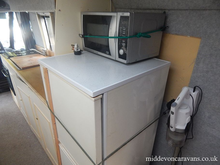 - Kitchen: Fully equipped for a chef’s delight with a Thetford dual-fuel hob (3 gas, 1 electric), separate thermostatic grill and oven, built-in digital microwave, and a Dometic 107-litre 3-way fridge with freezer compartment.